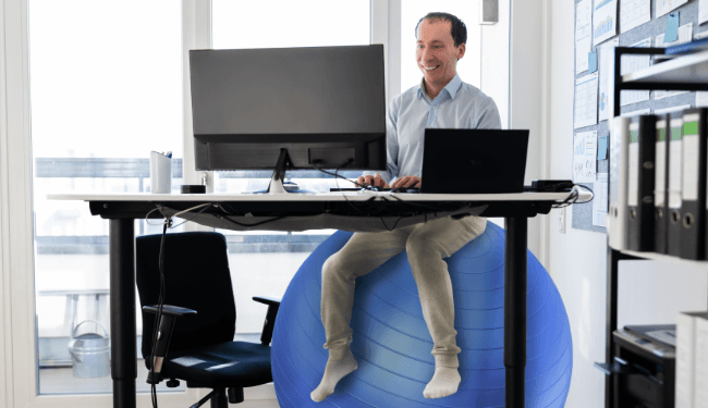 De 44-jarige Rens is positief over de nieuwe bal, zo laat hij weten: “Het is even wennen in het begin om een paar meter hoger te zitten dan je collega’s, maar na een tijdje went het wel. Ook ben ik al 4 kilo afgevallen doordat ik minder vaak koffie en snacks haal. Als je eenmaal van de bal afkomt, kun je er namelijk eigenlijk ook niet meer op.”