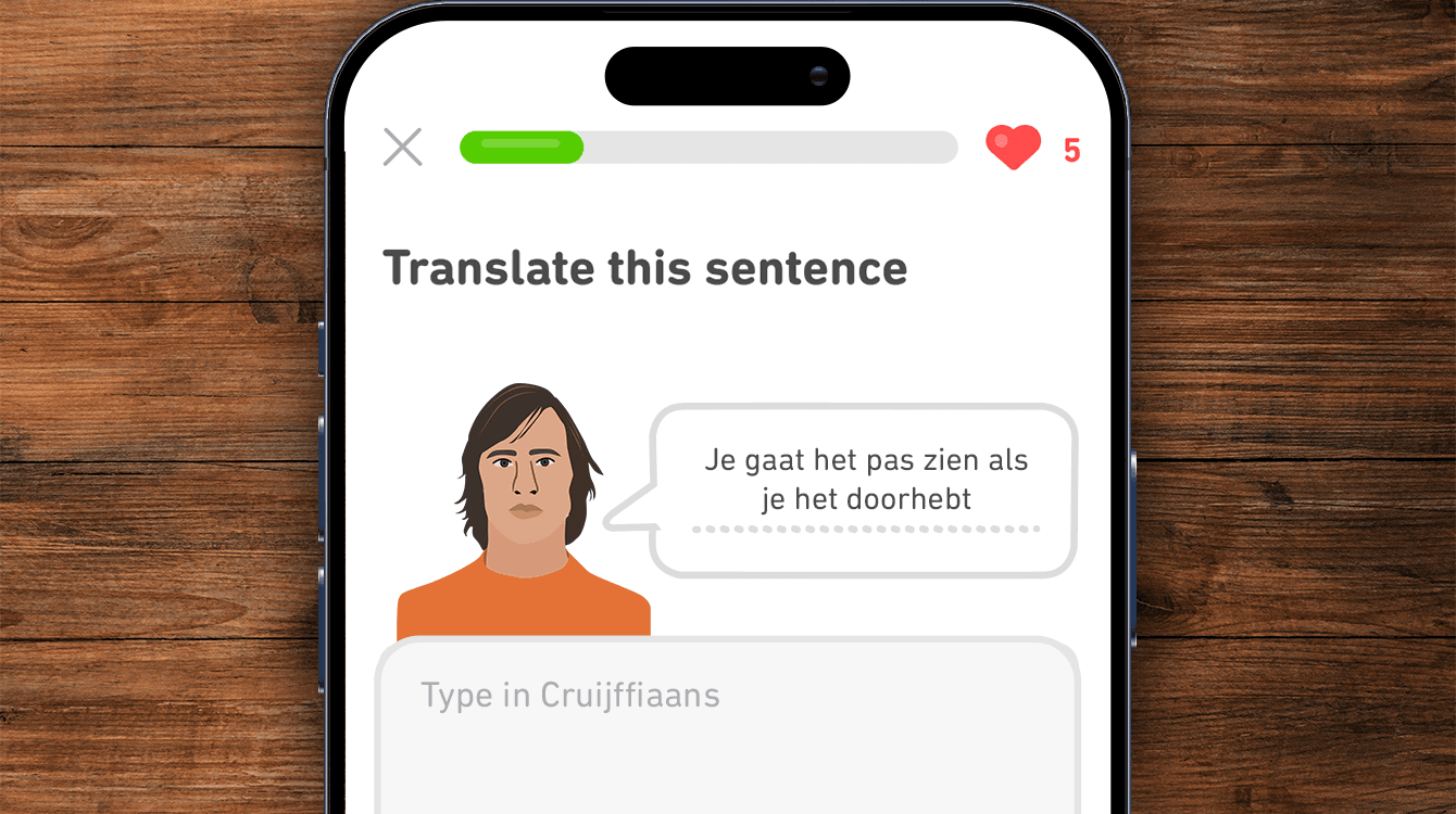 Duolingo heeft een nieuwe taal toegevoegd: naast bijvoorbeeld Engels, Duits, Spaans en Frans kun je er nu ook Cruijffiaans leren. “Het werd natuurlijk hoog tijd”, zegt een woordvoerder van het bedrijf. “Veel Nederlanders spreken wel een klein beetje Cruijffiaans en kunnen er nét het voordeel van het verdedigen van kleine ruimtes in uitleggen, maar echt vloeiend zijn maar weinig mensen. Daar gaan we nu verandering in brengen.”